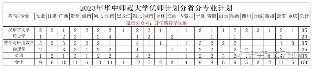 为贯彻落实习近平总书记关于加强中西部欠发达地区教师定向培养重要指示精神,推动巩固拓展教育脱贫攻坚同乡村振兴有效衔接,根据《教育部办公厅关于做好2021年中西部欠发达地区优秀教师定向培养工作的通知》(教师厅[2021]3号)精神,华中师范大学2023年面向中西部省(市、区)实施“中西部欠发达地区优秀教师定向培养计划”(以下简称“优师计划”)。“优师计划”坚持“定向招生、定向培养、定向就业”原则,面向实施地区乐教、适教的考生,择优招收本科定向就业师范生,为中西部欠发达地区定向培养志存高远、乐教适教的基础教育高素质师资和未来教育家。 一、招生范围 2023年面向安徽、甘肃、广西、贵州、海南、黑龙江、河北、河南、湖北、湖南、吉林、江西、内蒙古、宁夏、青海、山西、陕西、四川、西藏、新疆、云南、重庆等22个省(市、区)招收本科定向就业师范生。 二、招生专业及招生计划 1.招生专业。汉语言文学、数学与应用数学、英语、物理学、历史学等5个专业。 2.招生计划。2023年招生计划150个。根据各省(市、区)定向就业县域数量、师资队伍需求等,确定分省分专业招生计划,最终以各省级招生考试机构公布为准)。 三、报考条件 1.符合2023年全国普通高等学校招生全国统一考试报名条件; 2.理想信念坚定、思想品德优良,遵纪守法、诚实守信,乐教、适教,热爱教育事业、立志长期从教; 3.接受《优师计划定向就业师范生协议书》(以下简称:《协议书》)和本简章规定的权利和义务。 四、录取规则 1.“优师计划”为优师专项招生计划,实行单列志愿、单独划线,在本科提前批次录取。在高考志愿填报时,有意愿的考生需按省级考试机构相关规定填报华中师范大学优师专项计划专业志愿。 2.考生投档成绩(含政策性加分)须达到所在省(市、区)第一批本科录取控制分数线(对于合并本科批次的省(市、区)及实施高考改革省(市、区)本科第一批次录取控制分数线参照省级招生考试机构相关规定执行)。 3.对于符合我校录取要求的考生,确定考生录取专业时,以考生投档成绩为准,实行分数优先的原则,无专业级差。总分相同时,按相关科目排队,其中文史类考生依次比较文综、语文、数学、外语单科成绩;理工类考生依次比较理综、数学、语文、外语单科成绩;综合改革类省(市、区)(海南省、河北省、重庆市、湖南省、湖北省)考生依次比较语文、数学和外语单科成绩。若单科成绩完全相同,我校将使用预留计划录取。所有专业志愿都无法满足的考生,如果服从专业调剂,将调剂到其他专业;所有专业志愿都无法满足又不服从调剂的考生,作退档处理。对高考录取有特殊规定的省(市、区),其录取原则作如下说明: 综合改革省(市、区)(海南省、河北省、重庆市、湖南省、湖北省)考生须符合所填报专业志愿的高考选考科目要求,志愿规则遵循生源属地化原则,执行所在省(区、市)的相关政策。 对于内蒙古自治区考生,我校实行“招生计划1:1范围内按专业志愿排队录取”的录取规则。 4.按照顺序志愿投档的批次,在第一志愿考生生源不足的情况下,我校可接收非第一志愿考生,按照投档成绩择优录取。若符合条件的非第一志愿考生生源仍不足,将征集志愿。按照平行志愿投档的批次,未完成的计划也将征集志愿。征集志愿仍不足则将剩余计划调剂到其他生源质量好的省份完成招生计划。 5.我校执行教育部、卫生部、中国残疾人联合会印发的《普通高等学校招生体检工作指导意见》及有关补充规定。 6.考生入学报到时,须提交已签字确认的《协议书》,不提交者,视为放弃入学资格。 7.新生入校后,我校统一进行新生复查工作。凡复查不合格的新生,将按照有关规定进行处理,直至取消入学资格。 8.“优师计划”招收的定向就业师范生不办理入学户籍迁移。 9.入学后,“优师计划”定向就业师范生不得转为非优师专项学生,可按程序在“优师计划”招生专业内申请转专业。 五、学生培养 作为师范教育的国家队,教师教育是华中师范大学办学的鲜明特色。学校长期以来坚持“以生为本、以师为先”的办学理念,新时期坚持以高质量人才培养为中心,全面推进开放化和现代化,致力于培养德才兼备、博雅精专、高素高能的优秀人才。学校教师教育主要以“四有”好老师为标准,培养能够引领国家基础教育事业改革和发展、德智体美劳全面发展、具有未来教育家发展潜质的高素质专业化创新型卓越教师。 学校高度重视国家“优师计划”师范生培养: 一是高度强调师德和新时代教师理想信念教育。牢记“求实创新、立德树人”的校训,秉承“忠诚博雅、朴实刚毅”的华师精神,以“四有”好老师为标准,注重思政课程和课程思政协同,注重人文精神和科学素养的培养,注重优良教风、学风和校园文化建设,以文化人、孕育养成,厚植教育情怀,增强文化自信,落实立德树人根本任务,为师范生成长筑牢信念之基、精神之钙。 二是实行融合养成与特色培养相结合。学校注重师范生综合性融合养成教育,各类师范生在教育培养过程中能够综合养成、融通共进。同时,结合“优师计划”师范生培养特点,适当增加特色型培养内容或环节,实现通识性培养与个性化培养的有机结合。 三是加强基层教育实践体验。在师范生整体实践教学环节基础上,针对“优师计划